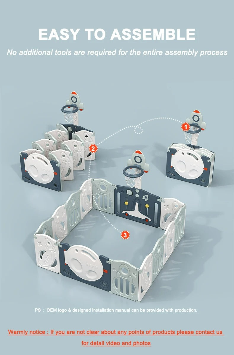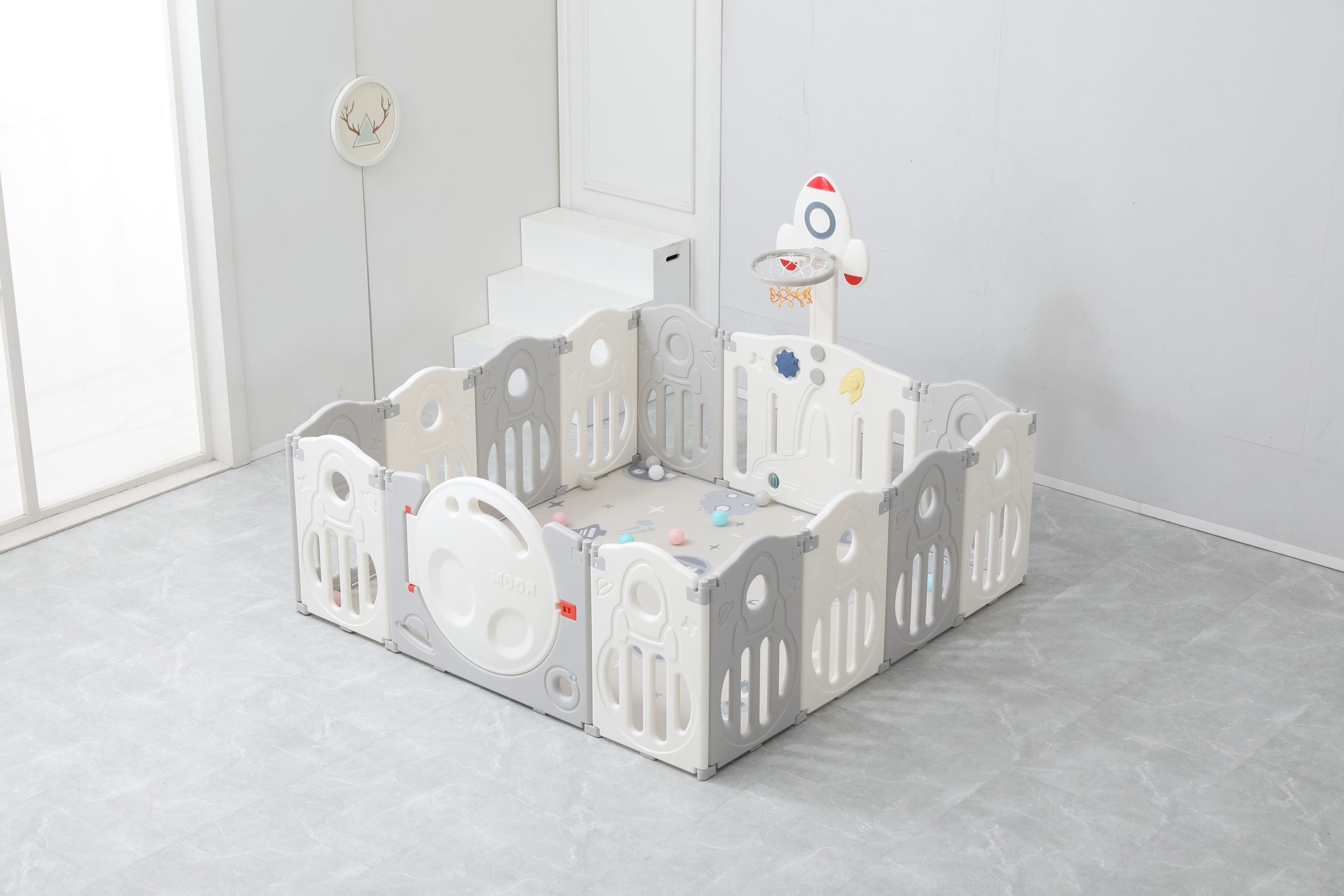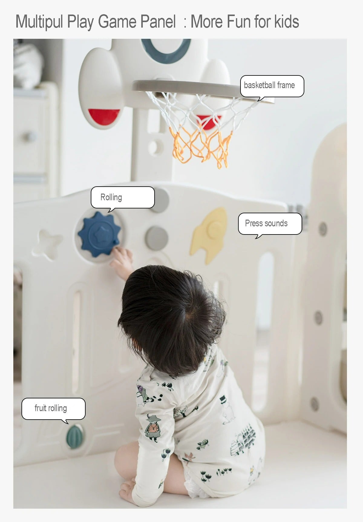 Ogradica “Raketa” u sivo beloj boji, dimenzija 200×160 cm i visine 63 cm, je pravi mali svet za vaše najmlađe – mesto gde mogu slobodno, bezbedno i srećno da se igraju, istražuju i razvijaju svoje veštine. Zahvaljujući 14 čvrstih panela, uključujući jedan panel za igru, kao i vrata i koš za košarku, ova ogradica otvara beskrajne mogućnosti za neograničenu igru i avanturu.