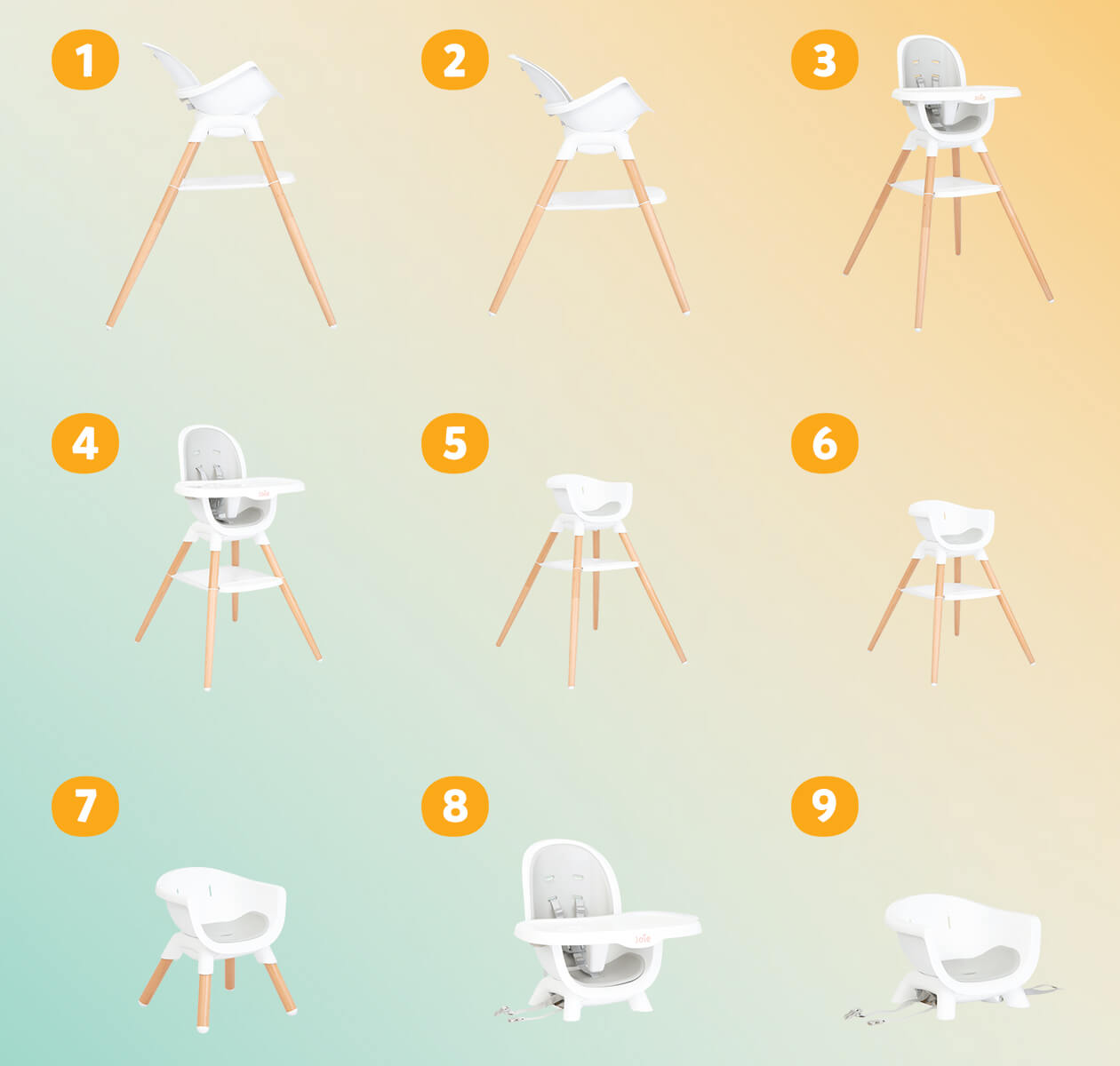 Joie Chestnut je multifunkcionalna hranilica koja raste zajedno sa vašim detetom od prvih dana pa sve do ranog detinjstva — od rođenja do otprilike 6 godina. Sa 9 različitih načina upotrebe, ova hranilica vam omogućava da je prilagodite potrebama deteta kroz sve faze razvoja i različite situacije — obrok, igra, crtanje ili kreativne aktivnosti.