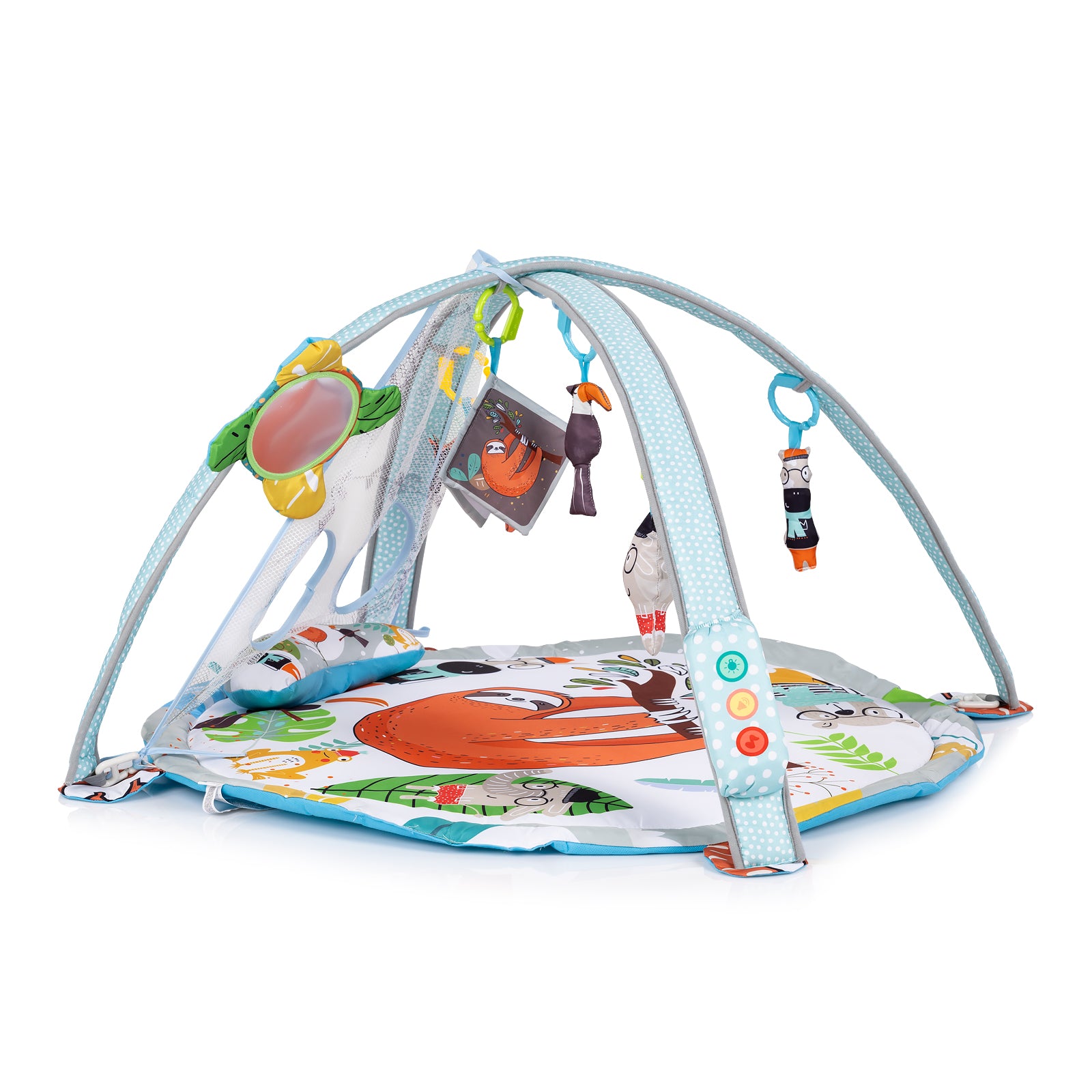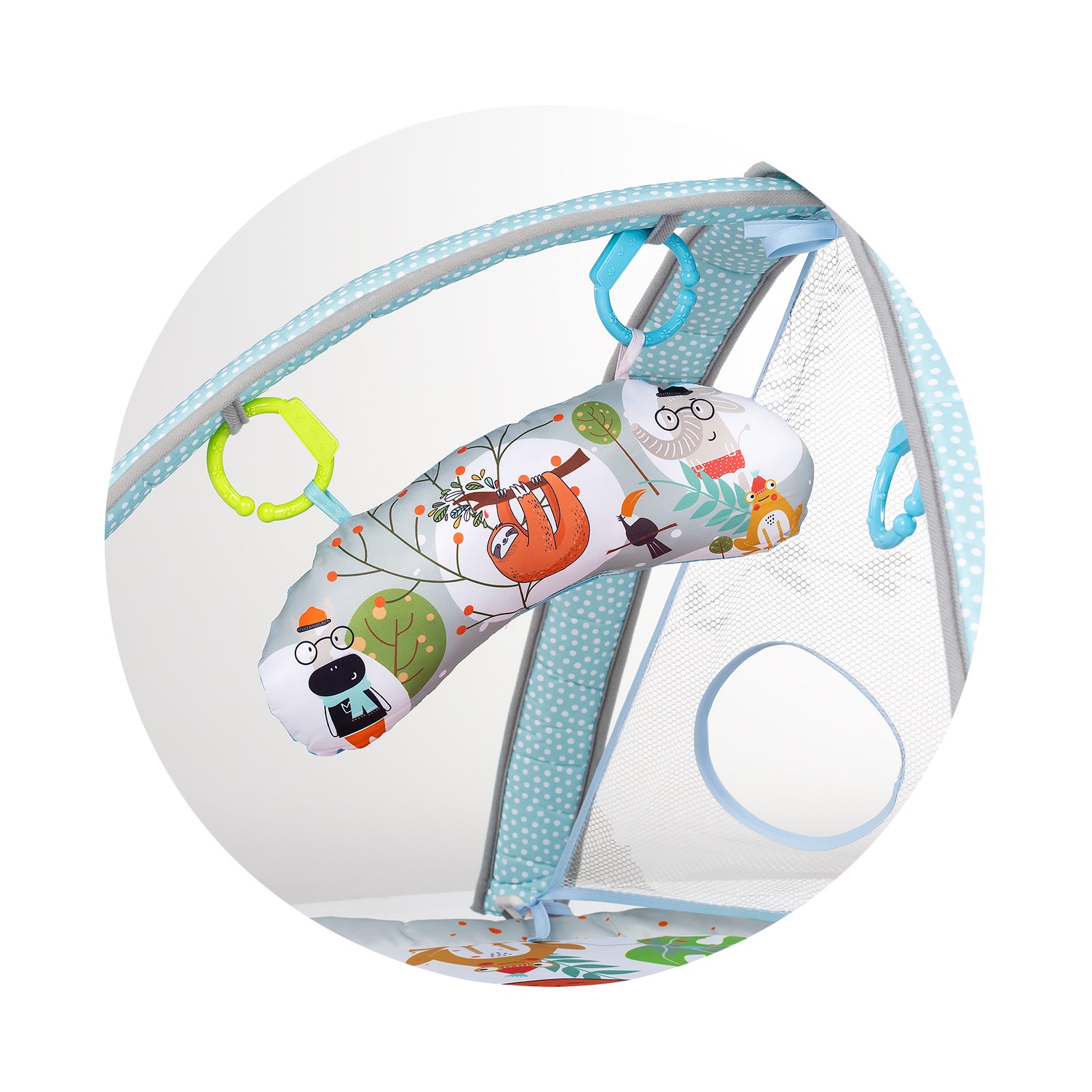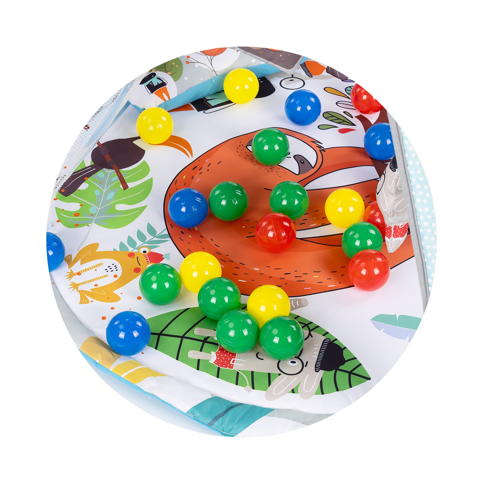 Ova bebi podloga za igru sa lopticama kombinuje zabavu i razvoj u jednom. Mekana podloga sa lukovima uključuje razne viseće igračke, ogledalo i šarene loptice, pretvarajući vreme igre u avanturu. Pogodno od najranijih meseci – za vreme na stomaku, igru na leđima ili kao mini jama sa lopticama za starije bebe.