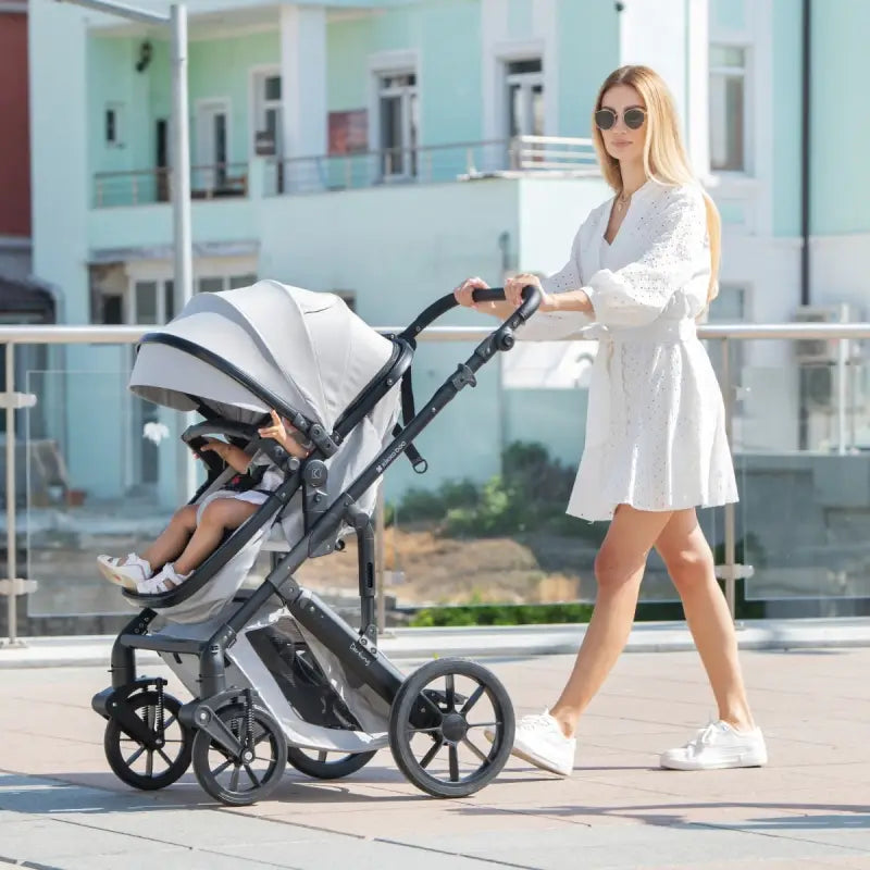 Set kolica uključuje i dodatne aksesoare kako biste imali sve što vam je potrebno za udobne i stilizovane šetnje - mrežica za insekte, navlaka za noge, držač za flašice, uložak za sedište kolica, torba.